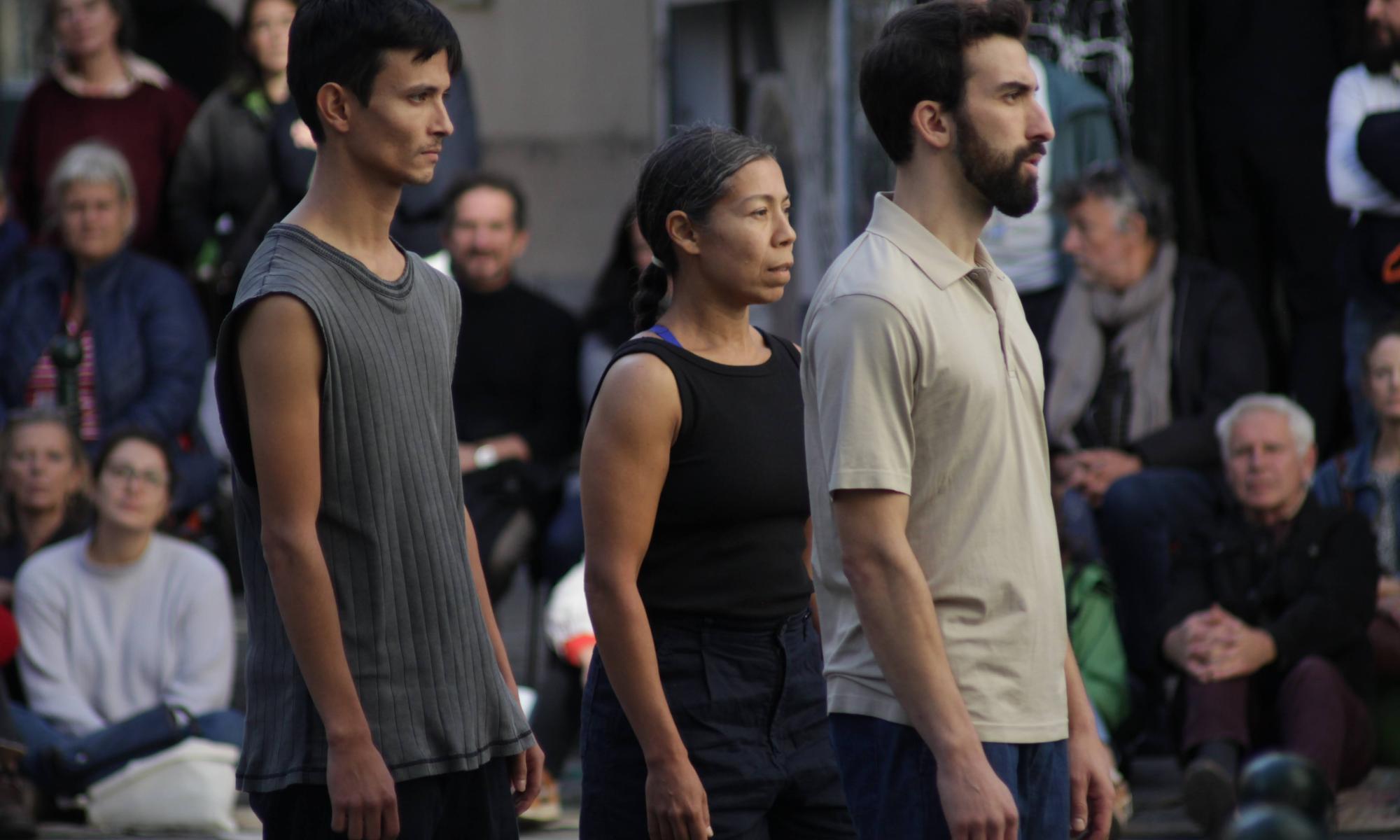 La lumière semble cadrer l’espace de mouvements et l’endroit où le contact est possible. Les voix résonnent comme un écho du comment s’approcher, s’éloigner de l’autre, de ce qu’est la proximité… S’emparant de la zone éclairée tout en la fuyant, les danseuses prennent peu à peu place dans le récit qu’elles content.